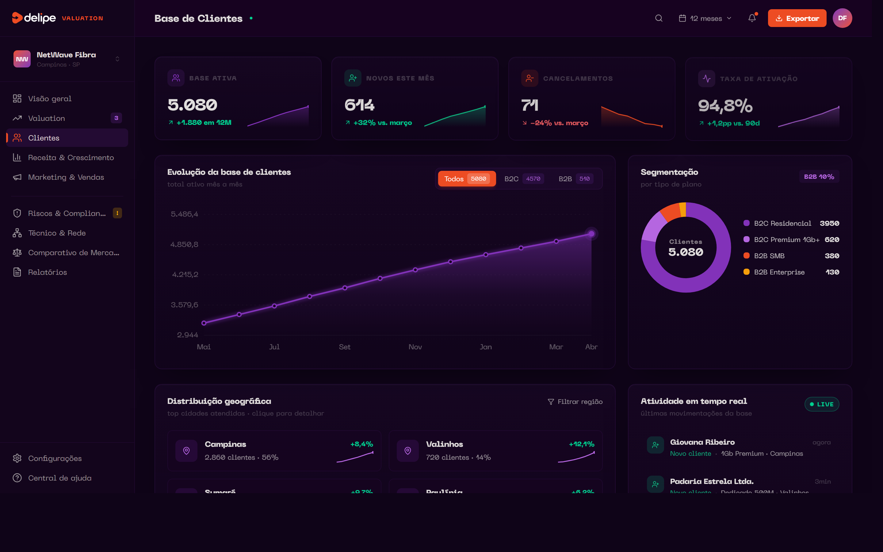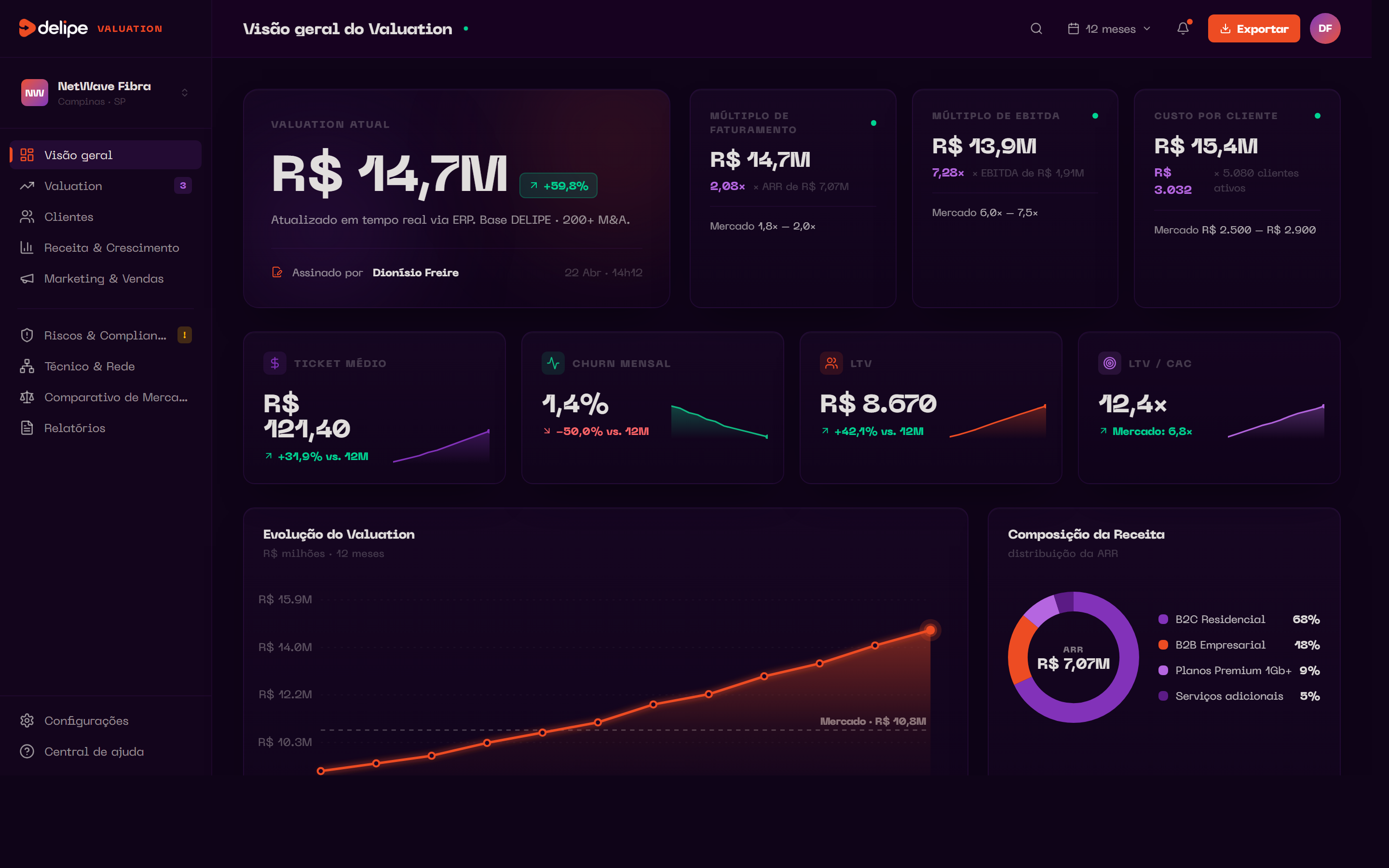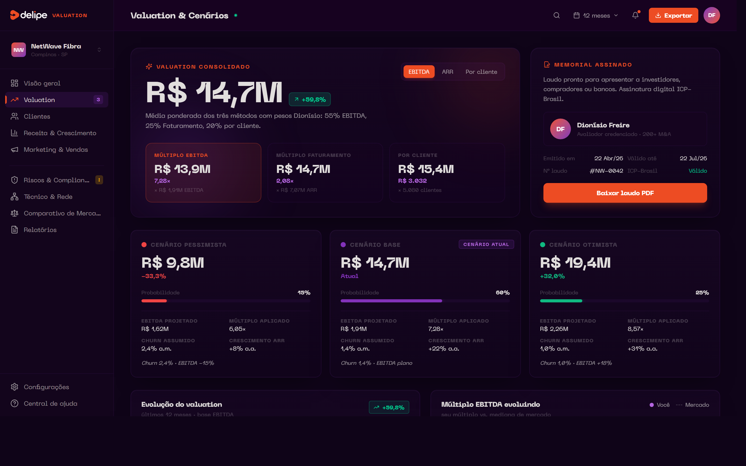 Entregamos o valor do seu provedor em múltiplo de faturamento, múltiplo de EBITDA e custo por cliente. Você escolhe a métrica mais estratégica para comprar, vender ou negociar com investidor, com comparativo direto com a média de mercado.