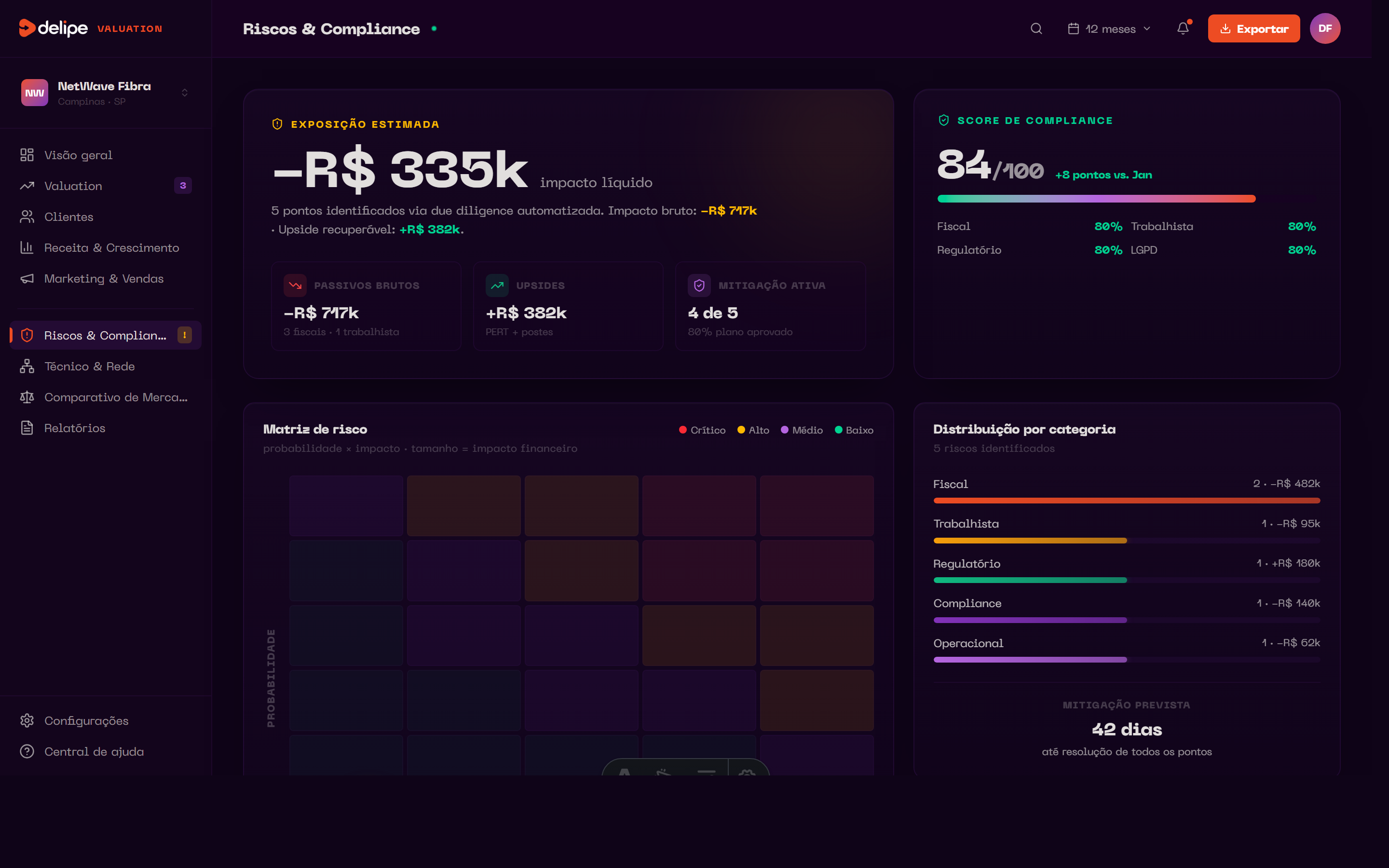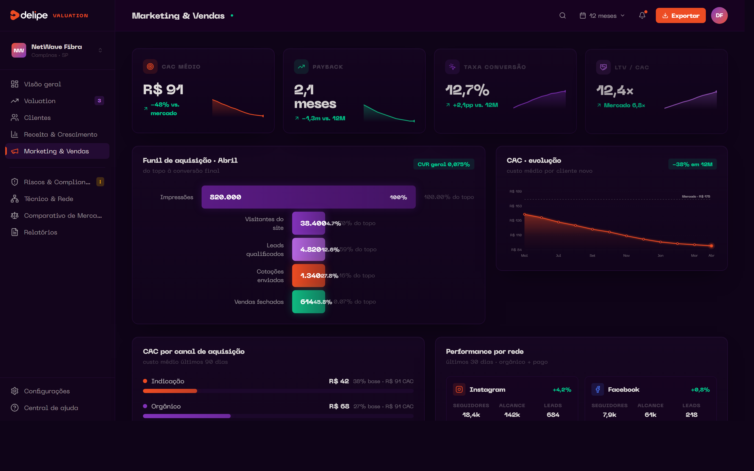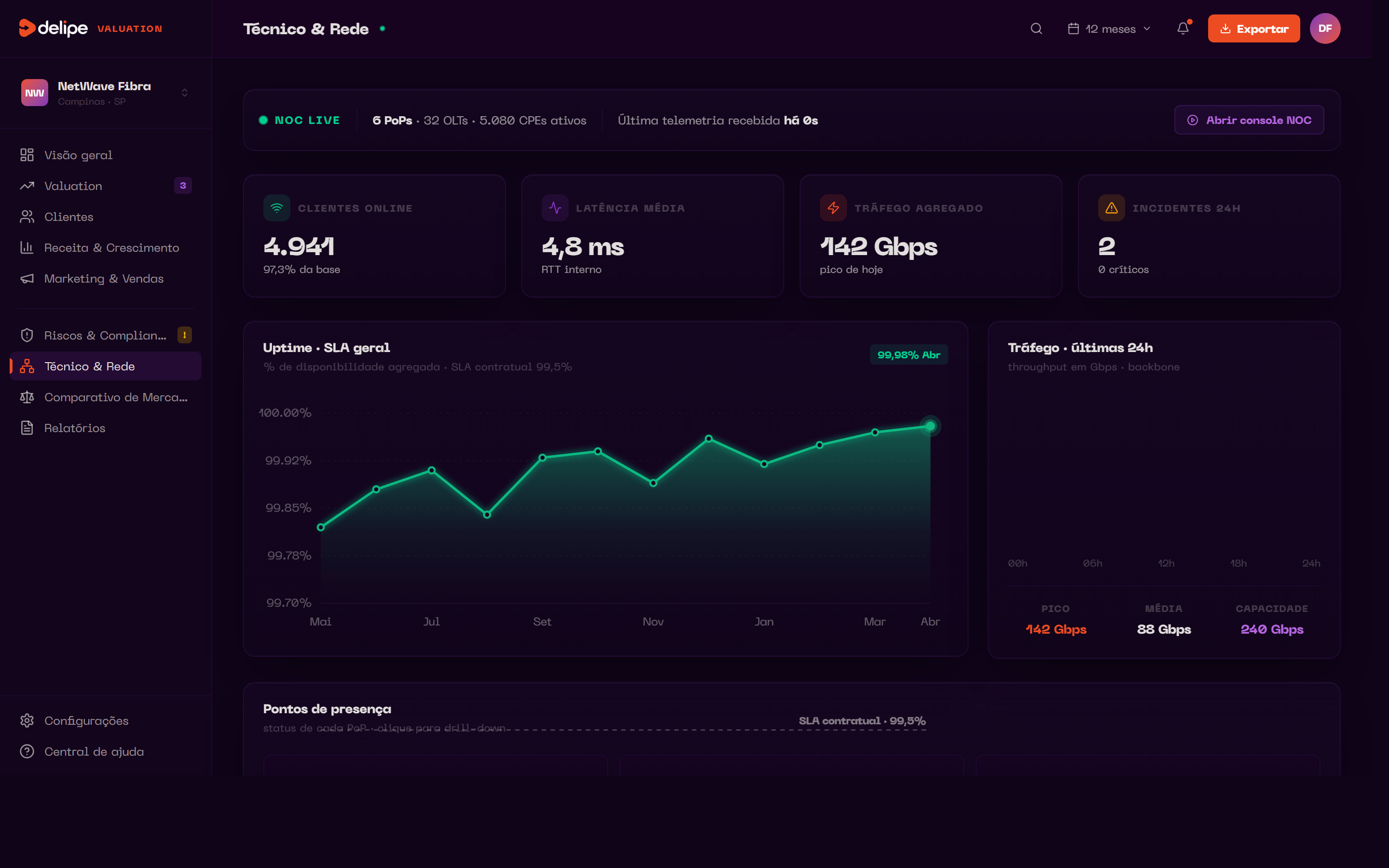 Entregamos o valor do seu provedor em múltiplo de faturamento, múltiplo de EBITDA e custo por cliente. Você escolhe a métrica mais estratégica para comprar, vender ou negociar com investidor, com comparativo direto com a média de mercado.